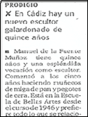El joven escultor recibe su primer reconocimiento: Premio en el Concurso de Opción Decorativa y Escultura en la Escuela de Artes y Oficios Artísticos y Bellas Artes de Cádiz.