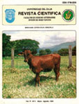 | Resumen en otro Idioma | The productive behaviour of 157 5/8 crossbred cows: 89 Brahman (Br), 29 Holstein (H) and 39 Brown Swiss (BS) x 3/8 indefined cows was characterized. The cows came from a commercial herd located in a dry tropical forest zone (10º 20’ NL y 72º 19’ WL) with 27º C means temperature with bimodal annual rainfall of 1200 mm. The animals were grouped according to their calving number in 1, 2 and 3 or more. The effect of age, body weight, and calving interval on length of lactation (LL), total milk production (TP), 305d milk production (P305) daily milk production (DP) and milk production per day of calving interval (PCI) were determined. The data was analized by the least square methods (SAS). For Br, H and BS with 1, 2, and 3 calving the results were: LL (P<0.05) 246.1 ± 98, 327.1 ± 101, 321.2 ± 111; 231.4 ± 79, 309.5 ± 57, 324.8 ± 57 and 220.7 ± 99, 302.8 ± 86, 312.4 ± 60d. TP (P<0.01) 2011 ± 951, 3007 ± 1219, 3087 ± 1309, 2324 ± 1055, 3806 ± 950, 3516 ± 802 and 2371 ± 1003, 3889 ± 1200, 3506 ± 1068 kg. P305 (P<0.01) 2011 ± 951, 3428 ± 883, 2929 ± 1000; 2324 ± 1055, 3737 ± 474, 3416 ± 641 and 2371 ± 1003, 3812 ± 992, 3416 ± 1004 kg. DP (P<0.01) 8.3 ± 2.0, 11.2 ± 2.6, 9.6 ± 1.9; 9.3 ± 2.0, 12.3 ± 2.0, 11.2 ± 1.8 and 10.1 ± 2.4, 12.5 ± 2.1, 11.2 ± 1.5 kg/d. PCI (P<0.01) 6.1 ± 1.3, 9.0 ± 1.8, 8.2 ± 1.3; 7.2 ± 1.4, 9.2 ± 1.9, 9.1 ± 1.8 and 7.4 ± 1.9, 9.6 ± 2.4, 9.1 ± 2.1 kg/d, respectively. Age, body weight and calving interval were significant. The 5/8 H crossbred cows had superior performance on all the traits in this study. |