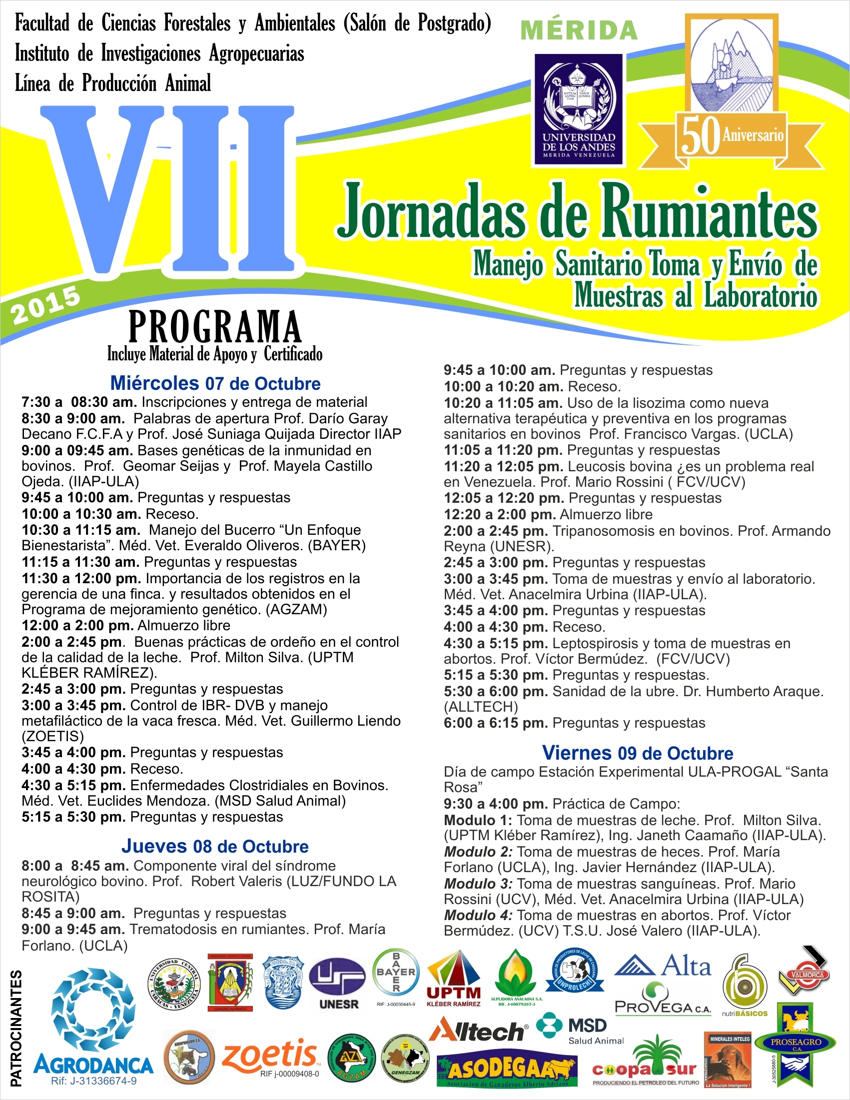 | Expositores | Prof. Mayela Castilla, mayelac@ula.ve; Prof. Geomar Seijas, geomarseijas@gmail.com; Méd. Vet. Anacelmira Urbina, anacelmira@ula.ve; Ing. Janeth Caamaño, janeth1971caa@gmail.com; Ing. Javier Hernández, javierh1007@gmail.com; T.S.U. José Nelson Valero, jnesca3@hotmail.com; Prof. María Forlano, dalilaforlano@gmail.com; Prof. Francisco Vargas,vargasfrancisco@hotmail.com; Dr. Euclides Mendoza, eucliepi@hotmail.com |