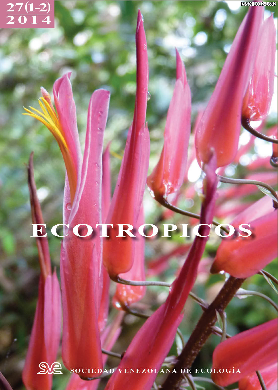 | Resumen en otro Idioma | Most Bromeliaceae are pollinated by hummingbirds constituting an important food resource for nectarivorous birds in the ecosystems that they inhabit. Pitcairnia nubigena is a terrestrial Bromeliaceae, endemic of the Venezuelan Andean range. P. nubigena’s floral phenology and nectar availability for their floral visitors were studied in a disturbed Andean cloud forest, evaluating inflorescence annual production, flower numbers by inflorescence, and nectar production. P. nubigena presented a continuous flowering pattern throughout the year, with 1-2 synchronic inflorescences per plant, and 49±20 flowers per inflorescence. Nectar was mostly produced during the first twelve hours of anthesis, in concentrations of 14.6±3.8% and accumulated volume of 33.9±23.4 μl. Nectar availability showed a variable monthly pattern with 0 to 9572 μl per month per every 100 plants and was defined by a constant flower production and asynchrony in inflorescence maturation. Nectarivorous birds could be exploting permanently this resource and complementing it with the production by other ornithophilic plants with specific local flowering patterns. |